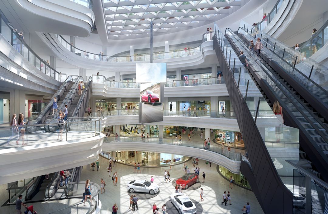 ↑项目首层至五层设计以大面积曲面为特色。根据设计效果图,内部采用了360°商业环动线设计,大大降低了空间结构的复杂性,从而提升了消费者逛店购物的便利性。