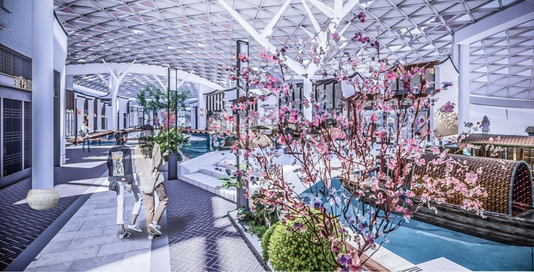 ↑“水”这一元素是项目设计的一大灵感来源。购物中心顶楼6层的空中水街——空中平江路,将极具形象感的江南水乡造型、特色房屋建筑、绿植池塘、步道座椅等融合起来,增加了市民的参与性。顶部的镂空玻璃提供光照的同时还营造了一种虚拟与现实碰撞的效果。