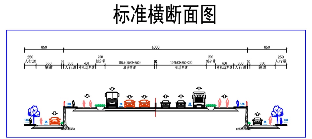 本次改造后为南北向双向六车道,改建项目全长914米,北起东方大道以南119米,道路宽度为49.5米,经过50米渐变段,道路拓宽至57米。