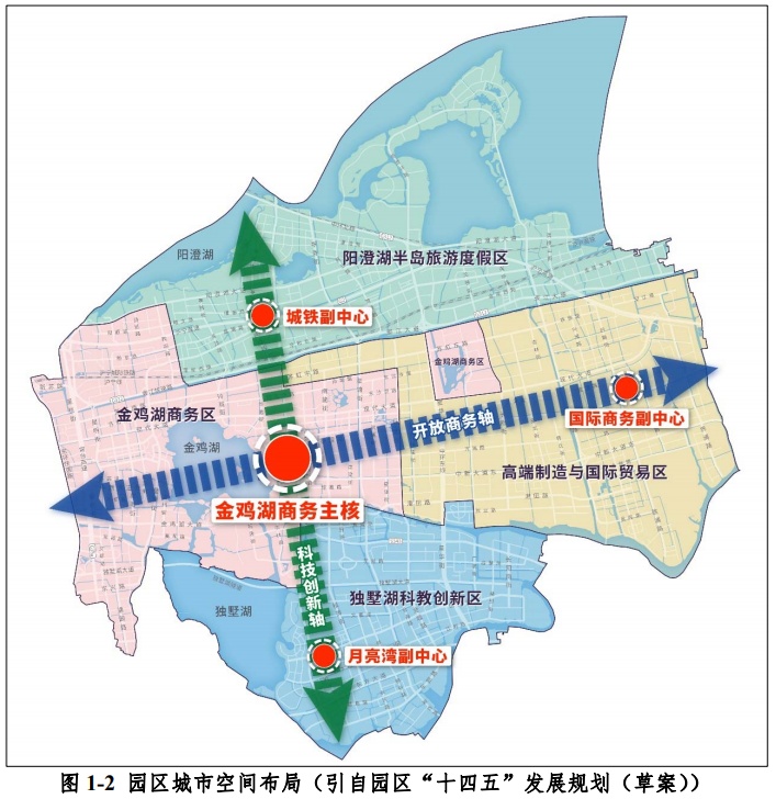 东西向开放商务轴:沿东西向地铁线串联苏州古城区-金鸡湖商务主核-高端制造与国际贸易区。