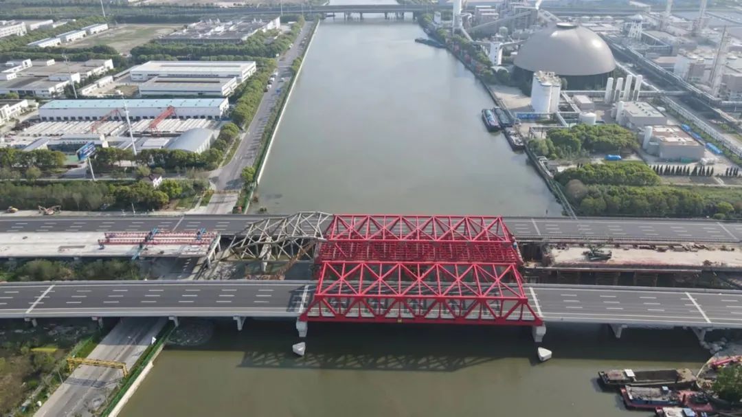 申张线青阳港段航道整治工程沪宁高速桥北半幅主跨钢桁梁完成顶推。至此,沪宁高速桥北半幅钢结构全部完成。