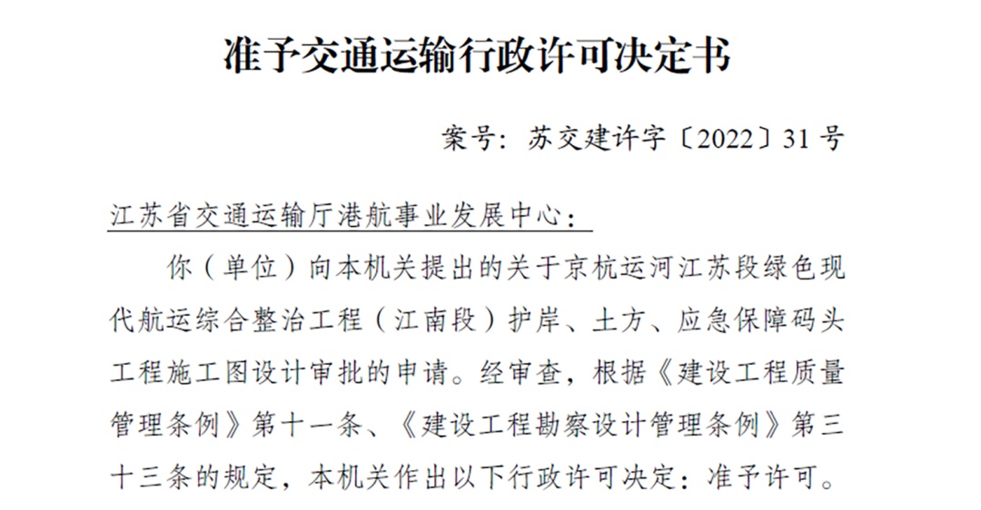 京杭运河绿色现代航运综合整治工程航道工程取得施工图设计批复。