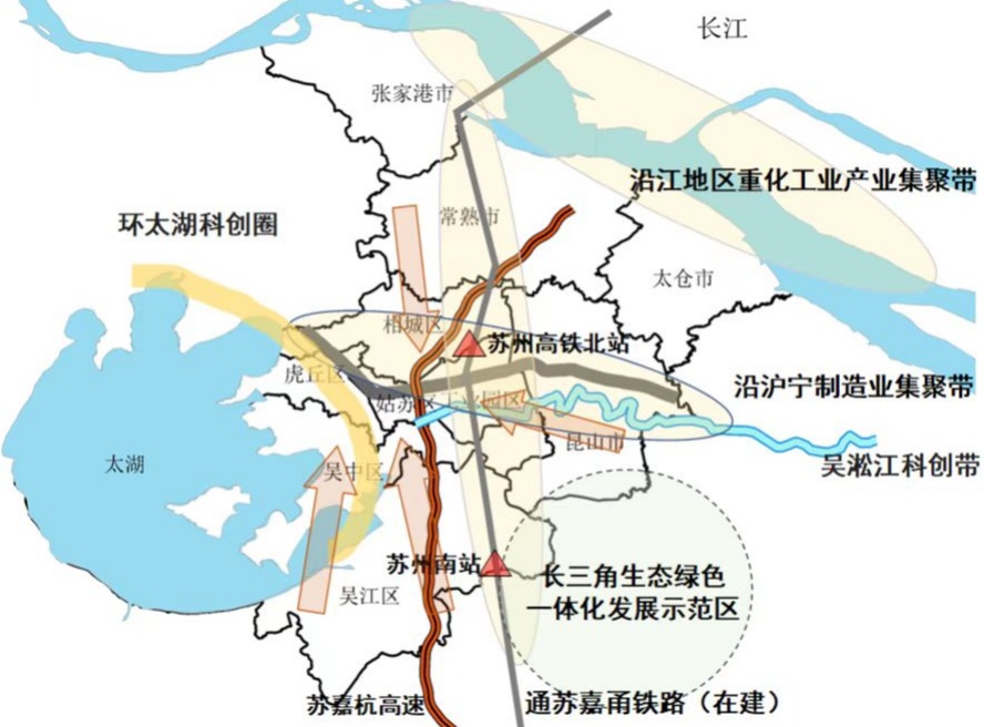 苏州产业创新集群的布局符合“点—轴系统”的模式。主要产业轴线体现了与上海的关系,目前制造业集群主要布局在两条重要的产业轴线。一条是沪宁制造业集群带,这个带与上海虹桥国际开放枢纽的北向拓展带基本吻合(除太仓以外),北向拓展带的太仓、昆山、工业园区、相城区等,如果加上姑苏、新区,大致占苏州经济总量的67%,可见这一条轴带在市域范围内的战略地位。另外一条是沿江重化工业带,这条轴带随着高铁的通车,利用高铁枢纽集聚高端要素推动重化工业的转型和发展战略型新兴产业。第三战略轴带是“吴淞江科创带+环太湖科创圈”。吴淞江要与太湖联系起来,不能割裂二者之间的关系。如果说沿沪宁和沿江产业是典型的制造业集群,其特征符合阳刚之气,那么“吴淞江科创带+环太湖科创圈”产业集群的发展特征更符合阴柔之美,二者形成刚柔相济、结构互补的产业创新集群的太极图。苏州向世人展现的不应该仅仅是制造业阳刚一面,也应该给世界展现围绕制造业发展的科创产业集群阴柔的一面,这与进入新阶段产业创新集群的发展总体目标是完全统一的。把这个太极图置于长三角整体发展格局之中,也是成立的。可见这条战略轴带是非常重要的。除了三条东西向的战略轴线以外,还有一条南北向的产业带,即苏嘉杭与未来的通苏嘉甬叠加的轴带,将沟通三条东西轴线,有利于实现市域范围内各个板块的协同发展,同时有利于提高中心城市的首位度。完整的苏州区域空间结构应该呈现出“丰”字型。“三横一纵”科学地反映进入新发展阶段苏州空间结构的特点,特别是在原有空间结构的基础上出现的潜在空间,要充分发挥潜在空间比如“吴淞江科创带+环太湖科创圈”、南北轴线在区域协同、市域一体化方面的重大作用。科学的空间结构是实现市域一体化和各板块协同发展的重要基础,它能够高效地组织市域一体化的动态空间过程。