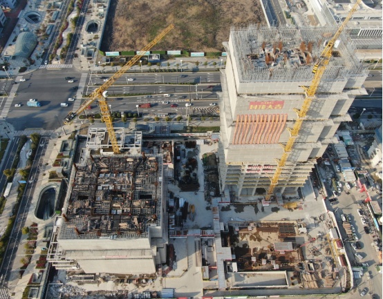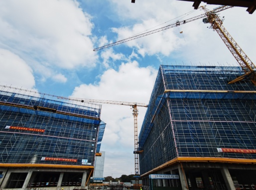 T1楼主体结构施工至10层;T2楼主体结构已封顶,二次结构3-12层施工;S1楼主体结构已完成。