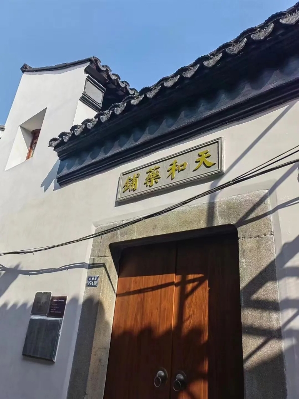“天和药铺”位于山塘街374号,其外形如金元宝的剖面,是苏州历史上第一家“行店合一”的药铺。