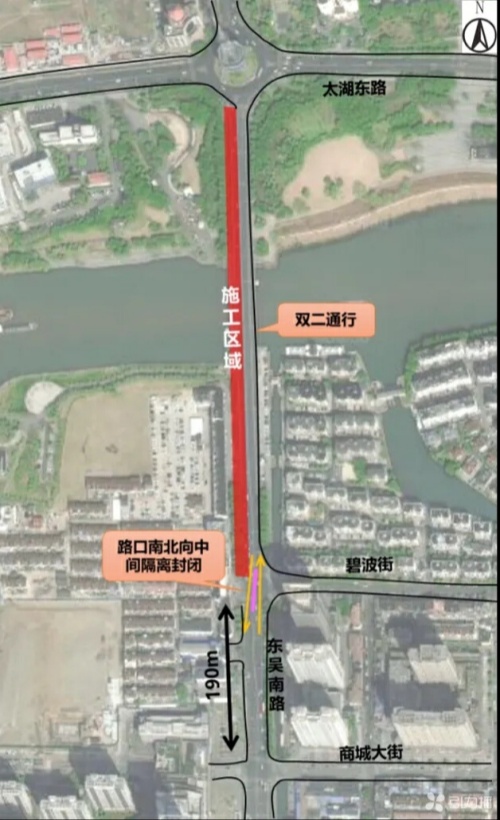 东吴南路-碧波街路口沿东吴南路中心隔离封闭,东吴南路车辆进出碧波街以“右进右出”方式通行。