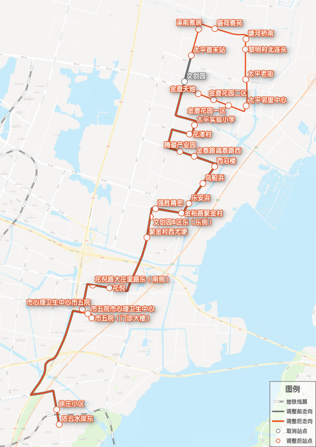 太平首末站、溪前雅居、盛荷雅苑、塘河桥南、黎明村北连头、太平老街、太平邻里中心、金澄花园一区、金澄花园二区、金澄天地、太平实验小学、花溇村、腾骏产业园、金泰路诚泰路西、西沿楼、鸟船浜、乐安浜、金裕路聚金村、强胜精密、文创园B区东(东侧)、聚金村西尤埂、花倪、花倪路大庄里路东(南侧)、市心理卫生中心市五院、市五院市心理卫生中心、市五院(门诊大楼)、徐庄小区、依云水岸东